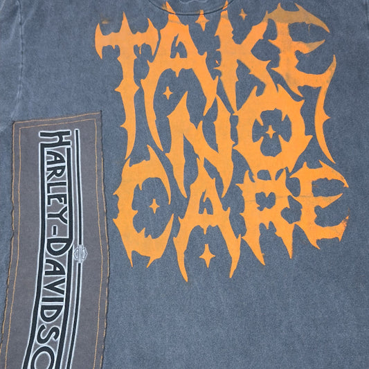 Take No Care rebuilds the top half of your wardrobe—upcycled, distressed, hand-sewn, hand-painted, bleached, dyed, patched, printed. No care given. Every detail cared for.